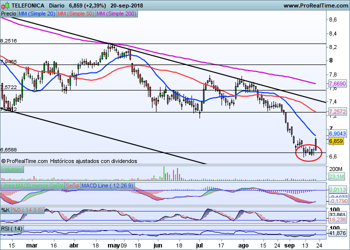 Bajo el punto de vista técnico, Telefónica, un valor de gran capitalización y un gran peso dentro del Ibex-35, ha formado suelo de corto plazo en esos 6.65 euros y desde ahí trata de formalizar cierto rebote, aunque dentro de una tendencia de fondo bajista. La sobreventa acumulada es excesiva así como la consiguiente pasada de frenada del valor que durante meses no ha parado de caer. Posibilidad de entrada si confirma en precios de cierre semanal por encima de 6.80. Stop por debajo de 6.60 en cierres.