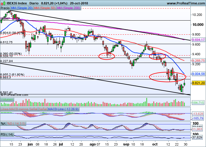 Volviendo al Ibex, y si atendemos a lo que vemos en su gráfico, observaremos que se ha formado un claro canal bajista y hemos ido a buscar justo su parte más baja, en los entornos de los 8.600 puntos. Desde aquí deberíamos rebotar, aunque la tendencia bajista seguirá vigente mientras no se superen los 9.700 enteros, por lo tanto, todavía queda camino a recorrer para poder cambiar de tendencia. Vamos a ver si para la última parte del ejercicio somos capaces de recuperar terreno perdido y al menos devolver a determinados valores a nivelesl óptimos de cotización, puesto que gran parte del Ibex está por debajo de su valor en libros, y veréis cómo cuando se produzca un rebote éste es con virulencia, fruto del cierre de posiciones cortas y de la entrada de dinero rápido aprovechando el fuerte descuento.