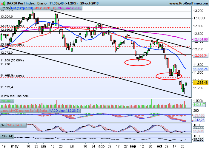 A corto plazo, es necesario que el rebote que parece haber iniciado el Dax se sostenga, y para ello debe superar esos 11.450 puntos y anular la actual tendencia bajista de corto plazo. Lo visto hasta hoy ha sido una "pasada de frenada" en toda regla, puesto que la caída que lleva acumulada el índice pensamos que ya es demasiada. Debería haberse parado en el nivel Fibo que acabamos de comentar.