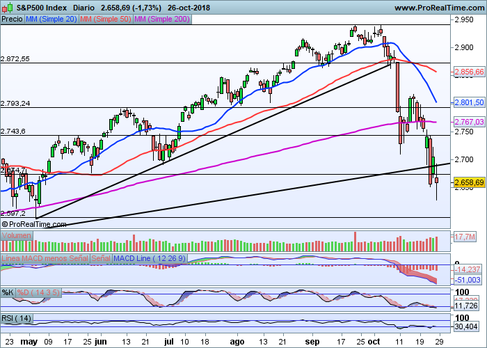 En cuanto al S&P500 en particular, estos dias trata de recuperar la directriz alcista de medio plazo que ahora mismo pasa por la zona 2.700 puntos y que eliminaría de un plumazo el riesgo bajista. Es vital que esto suceda para que en Europa siga el rebote iniciado estos dias y que tenga su continuidad.
