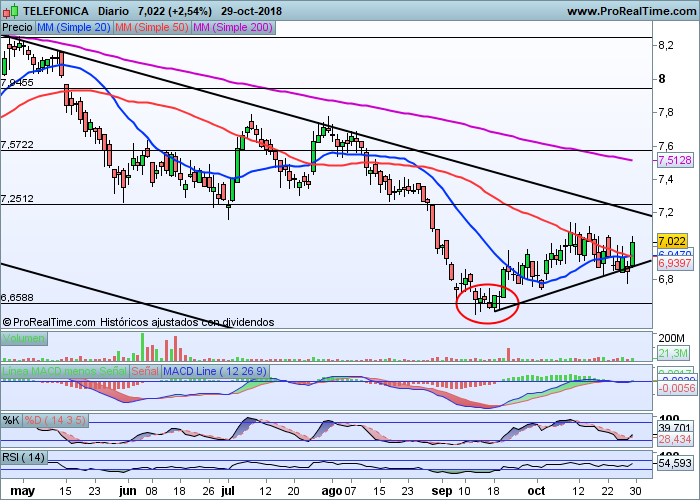 Superados estos 7.20 euros ya no habría parada hasta 7.50 y 7.90, además de que la tendencia cambiaría de bajista a neutral o incluso alcista. Por valoraciones Telefónica, hoy por hoy, vale mucho más que esos 7 euros donde cotiza. Es la primera operadora de nuestro país, sus benefícios siguen creciendo, y aunque no lo hagan al ritmo de los últimos años debido a la competencia, es una compañía atractiva por valoraciones y por técnico en la que se puede intentar una entrada aprovechando el fuerte descuento con el que cotiza.