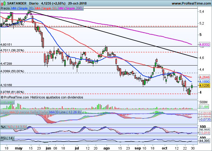 En el caso de Santander, sus títulos han entrado en fase de reacción, una corrección que le ha llevado a buscar exactamente el 61.80% de Fibonacci a toda la gran subida desde 2.80, es decir, ha alcanzado los 4 euros que es un nivel de soporte importantísimo para el valor y desde donde presumiblemente rebotará.