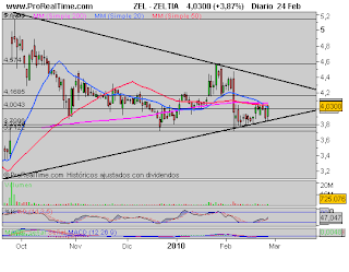 Natra: Haciendo suelo por la zona del 2.20. Buena compra, puesto que el vértice que une el soporte que os he comentado, y la directriz debe ser roto al alza. El valor tiene buena pinta, y , al igual que Zeltia, a poco que repunte el mercado, podremos ver nuevas alzas. La formación de suelo es clara y podéis verla en el gráfico.