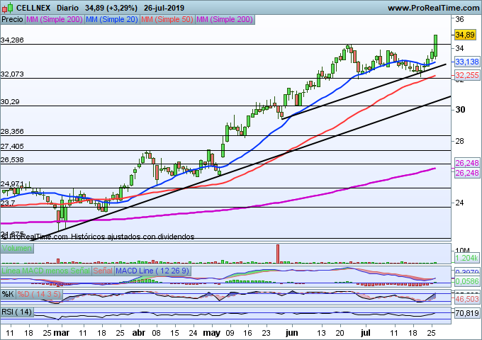 Rompe al alza y lo hace con la suficiente fuerza, aunque no con el volumen, como para pensar que puede ser una ruptura buena. Hablamos de la zona de resistencia horizontal que representan los 34.30 euros por acción, y lo corrobora la potente vela alcista con cierre en máximos de la sesión que nos deja unos niveles de trading bastante claros.