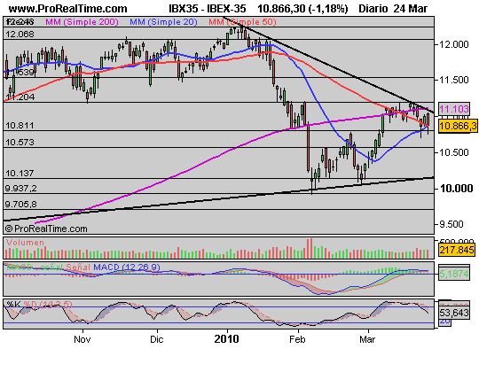 Íbex-35: Nivel de resistencia en los 11.000 puntos y entornos. La media de 200 sesiones pasa justamente por encima del precio. A corto, deberíamos superar esta zona para alcanzar nuevos objetivos como son los 11.500 puntos en primera instancia. De no superar esta zona, por debajo, podríamos ver perfectamente los 10.200 puntos en un breve espacio de tiempo.