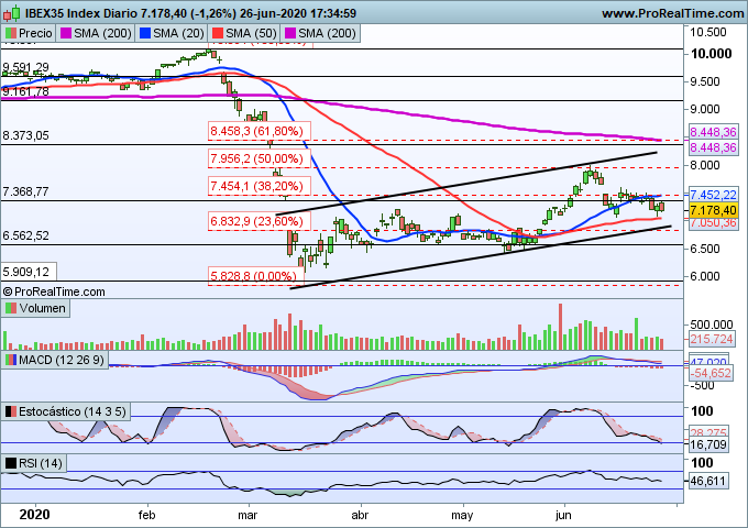 El selectivo de la bolsa española se encuentra algo más débil que el resto de sus homólogos europeos, y aunque se encuentra en fase de recuperación de la última gran caída desde máximos en 10.100 hasta mínimos en 5.800 que llegó a alcanzar el pasado mes de marzo, a duras penas ha recuperado el 38.20% de Fibonacci a esta gran caída, aunque eso sí, en una secuencia de mínimos crecientes perfectamente canalizada, pero todavía muy cerca de sus mínimos interanuales.