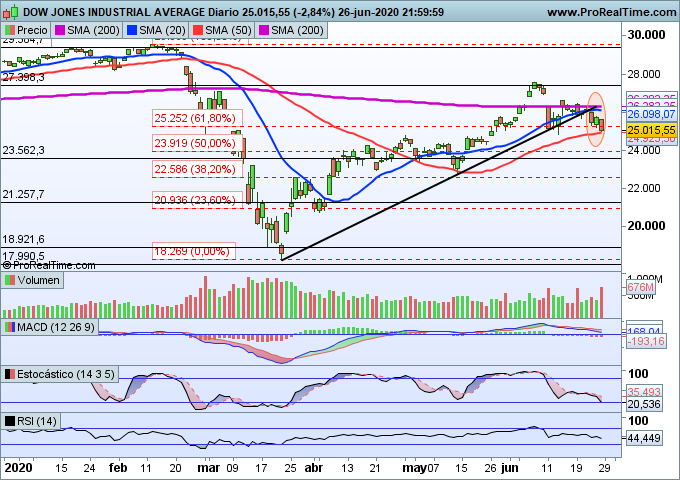 Problemas para el Dow Jones que se ve incapacitado para alcanzar nuevos máximos, al menos por el momento, y es que los 27.500 puntos parece que se han atragantado para uno de los principales índices americanos, que además y tal como podemos ver en el gráfico adjunto, también ha perdido su directriz alcista en las 3 últimas sesiones. El cierre semanal no ha favorecido para nada su cotización y ha empeorado significativamente su aspecto técnico.