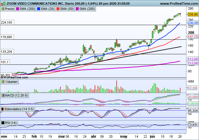 Zoom Video es una compañía dedicada a programas de videollamadas y reuniones virtuales accesible desde computadoras de escritorio, portátiles, teléfonos y tablets, sigue su escalada en bolsa a muy buen ritmo. Desde prácticamente el pasado mes de febrero el valor no ha hecho más que subir, ya que con la crisis del coronavirus y todo lo que lleva consigo, el número de conexiones virtuales se ha multiplicado, también el teletrabajo ha sido un detonante para que el valor alcance jornada sí, jornada también, nuevos máximos.