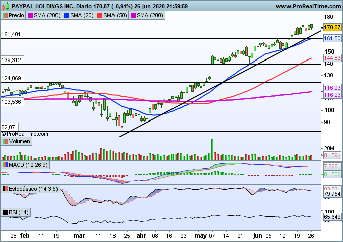 Un valor perteneciente al tecnológico Nasdaq que nos deja un gráfico más que interesante a corto y medio plazo. La pandemia del coronavirus ha provocado que una gran parte de los pagos se efectúen con tarjeta, o cuanto menos sin efectivo, algo que ha beneficiado a valores como Paypal, que continúa con la estela alcista iniciada en el mes de abril hasta el momento actual.