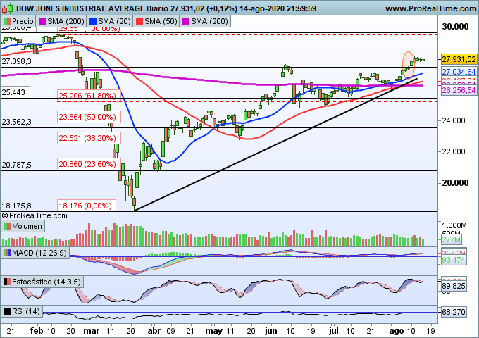 Por su parte, el mercado americano prácticamente en su conjunto sigue con una fuerte revalorización desde los mínimos del pasado mes de marzo, que en el caso del Dow Jones se situó en los 18.175 puntos, dando forma a una secuencia de mínimos crecientes donde todo apunta hacia máximos interanuales en la zona de los 29.550 puntos.