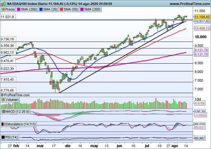 La directriz es netamente alcista y mientras no se pierdan los 10.900 puntos no hay ningún peligro que se revierta la actual tendencia. Sus tres medias móviles más representativas siguen alcistas y el precio se sitúa por encima de todas ellas. Buenas perspectivas técnicas para este índice estadounidense.