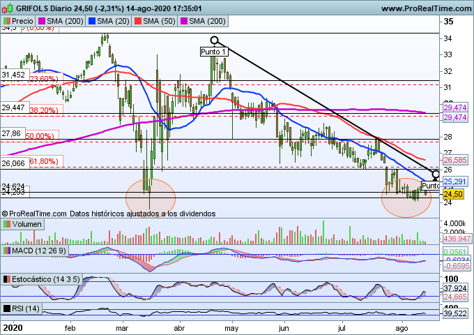 La fabricante de hemoderivados, es uno de los pocos valores del Ibex-35 donde mejor se puede fer la formación de suelo de mercado a corto y medio plazo. Las inmediaciones de los 24.50 euros ya sirvieron para construír un rebote importantísimo allá en el mes de marzo, rebote que llevó a este valor a alcanzar cotas cercanas a los 34 euros la acción, prácticamente en zona de máximos interanuales. Después vino al debacle de Grifols construyendo una secuencia de mínimos decrecientes, y en la actualidad trata de agarrarse al soporte de esos 24.50 euros y de momento lo está consiguiendo.