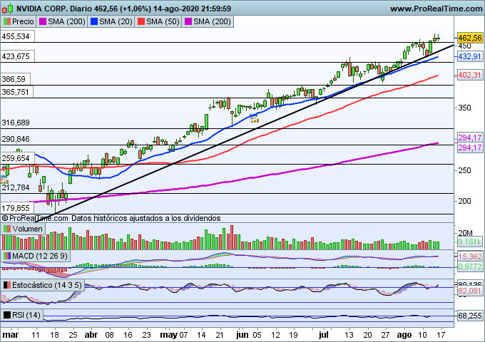 Con una impecable tendencia alcista, proyectada desde los mínimos del pasado mes de marzo, Nvidia suma y sigue, apoyándose en su directriz que, pese a haberla tanteado ya en alguna que otra ocasión, sigue vigente en el momento actual. Un valor que ya hemos venido comentando desde hace algunas sesiones y que cualquiera que haya entrado siguiendo nuestras valoraciones estará ganando dinero.