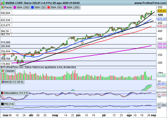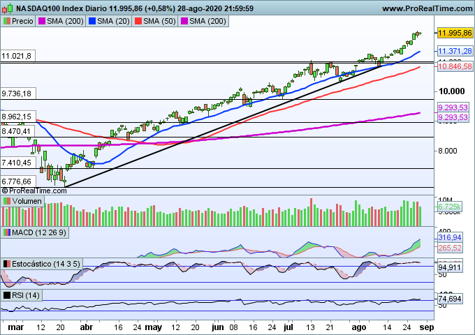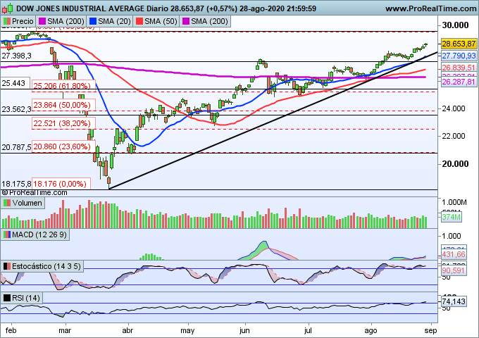 Un índice que comenzó a rebotar a mediados del pasado mes de marzo cuando alcanzó sus mínimos interanuales en los 18.175 puntos, un rebote en forma de V, recuperando prácticamente todo lo perdido como consecuencia de la crisis del Covid-19. Los niveles de sobrecompra son muy elevados, aunque esto al menos de momento, no está sirviendo para que los inversores más temerosos vendan. Como consecuencia de ello, las alzas se prorrogan sesión sí, sesíón también.