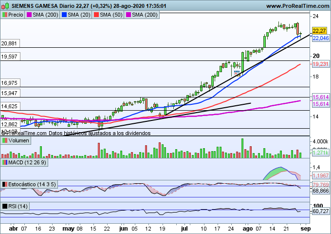 Indagando en el gráfico de los valores pertenecientes al selectivo de la bolsa española, nos topamos con Siemens-Gamesa, un valor que ha estado en el candelero de grandes y pequeños durante las últimas semanas e incluso meses. Comenzando con que la actual crisis del coronavirus le afectó mucho menos que al conjunto del mercado durante los meses de febrero y marzo tan complicados que tuvimos, la posterior recuperación y alzas del valor han sido muy importantes.