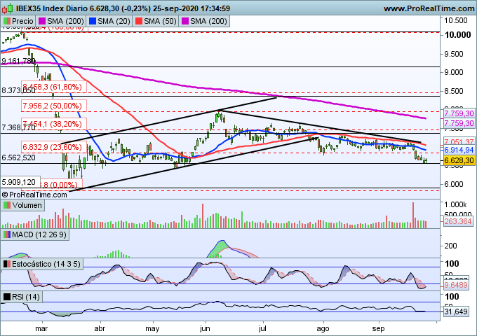 Detectamos cierto incremento en el volumen de negociación experimentado por el Ibex en las últimas sesiones, coincidiendo con la cercanía de este soporte, lo que incrementa las probabilidades que sigamos subiendo a corto plazo. Para superar niveles de neutralidad de nuestro índice, deberíamos ver niveles por encima de los 7.100 puntos, que es por donde pasa la directriz bajista que se extiende desde los máximos del pasado mes de junio. Si finalmente se consigue superar esta cota, se podría entrar en algunos valores con mucho menor riesgo que hacerlo ahora mismo.