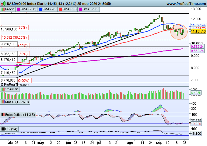 Respecto a los índices tecnológicos, especialmente el Nasdaq100, analizamos este activo ya que parte de nuestra CARTERA se encuentra expuesta a estos activos. Técnicamente, el Nasdaq100, ha sujetado su caída justo en el primero de los niveles de retrocesión proporcional Fibonacci 23.60% a toda la gran subida anterior, o lo que es lo mismo, niveles próximos a los 11.100 puntos.