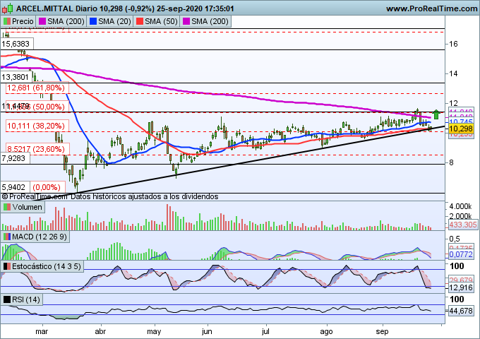 Importante la subida de hoy de los títulos de Arcelor Mittal. El sector siderúrgico y el de la automoción han sido protagonistas de una sesión de rebotes, algo que ha beneficiado claramente a la acerera que cotiza dentro del Ibex-35 que continúa su camino hacia su nivel objetivo de corto y medio plazo.