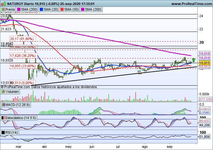 Ante este escenario, y para inversores conservadores, podemos optar por valores considerados como "refugio", y en Naturgy tenemos un muy buen ejemplo de ello. Técnicamente, afronta una secuencia de mínimos crecientes en gráfico diario, semanal y mensual desde los mínimos alcanzados el pasado mes de marzo. Una secuencia netamente alcista que debería llevar a sus títulos a la zona de los 17,65 euros y después a los 18,90 enteros, que son el 23.60 y el 38.20% de Fibonacci a todo el gran tramo bajista previo.