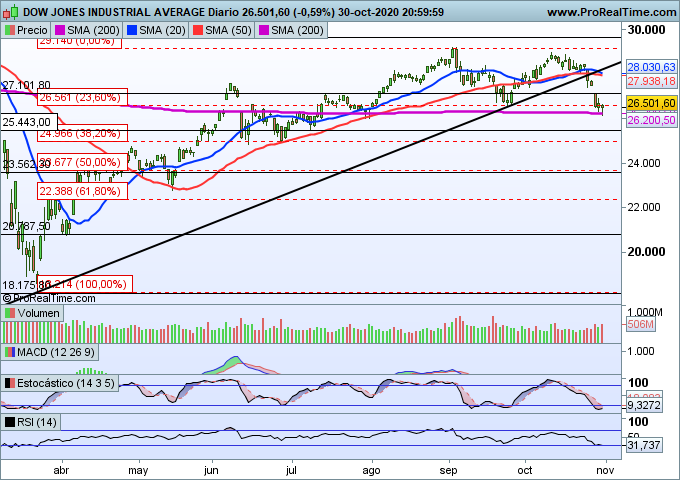 El mercado americano en su conjunto también está sufriendo en los últimos dias, en este caso la incertidumbre que está provocando las elecciones en EEUU que se celebrarán mañana martes, y donde una gran cantidad de norteamericanos ya han votado. Tanto sus principales índices directores como los dos Nasdaq han protagonizado recortes de más o menos importancia a la hora que no podían con su zona de máximos interanuales.