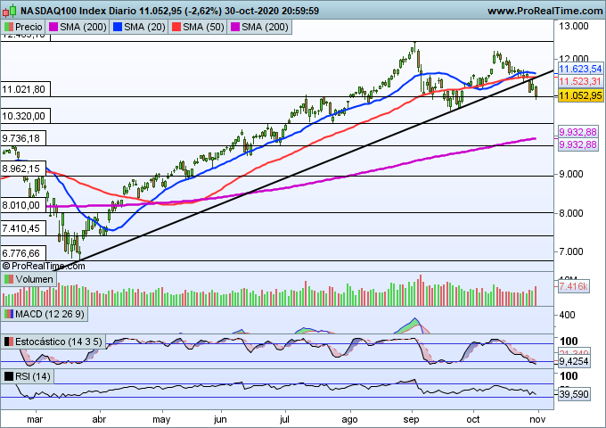 Los índices Nasdaq no han sido ajenos a todas estas últimas sesiones de debacle de la renta variable casi mundial, como consecuencia de la pandemia del coronavirus, y además la incertidumbre que generan las elecciones en EEUU. Los índices tenológicos como el que nos ocupa, han perforado a la baja sus respectivas directrices alcistas. En este caso, la pérdida de los 11.500 puntos, elevó las probabilidades de un posible recorte más importante, pero el índices se aferró a su zona de soporte horizontal que se sitúa en los 11.000 enteros.