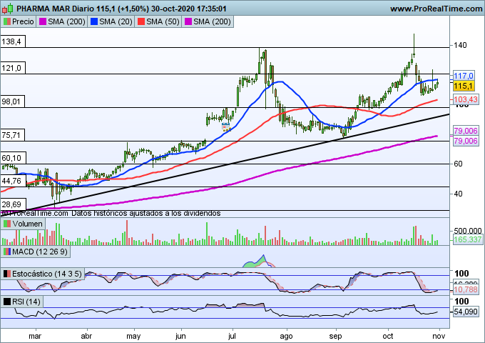 Analizando concienzudamente cada uno de los valores pertenecientes al selectivo de la bolsa española, detectamos que Pharmamar es uno de los pocos que mantienen su sesgo netamente alcista con formación de mínimos crecientes en el momento actual, y que respeta en todo momento su directriz alcista.