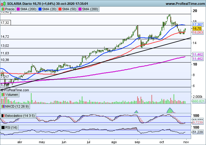 Los títulos de Solaria, si tenemos en cuenta los mínimos alcanzados el pasado mes de marzo cerca de los 5,75 euros la acción hasta los máximos del pasado mes de octubre, podemos trazar una interesante línea de tendencia alcista que el valor ha respetado en su totalidad. La secuencia que ha dibujado es una secuencia netamente alcista con formación de mínimos y máximos crecientes.