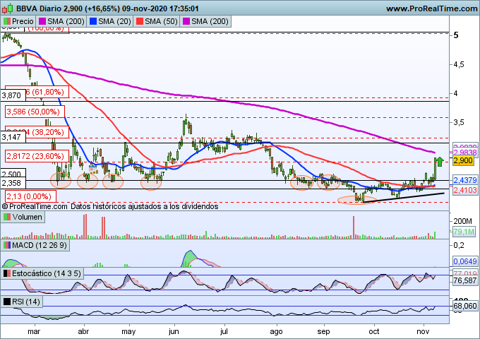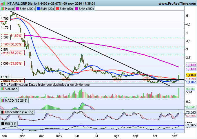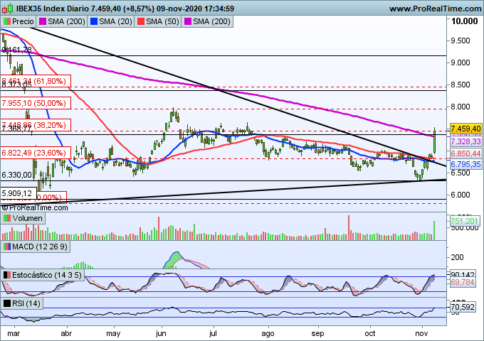 Mejora sustancial, según criterios técnicos, la que nos ha dibujado en la sesión de hoy el selectivo de la bolsa española después de conocerse que Pfizer ha anunciado que su vacuna proporciona una efectividad del 90%, además de conocerse también quién será el próximo presidente de los EEUU, Joe Biden, que beneficiará sin duda a los mercados y valores europeos, puesto que de momento no se prevén nuevos aranceles, y seguramente la desaparición de algunos de ellos. La movilidad aeronáutica también será clave y fundamental a partir de ahora.