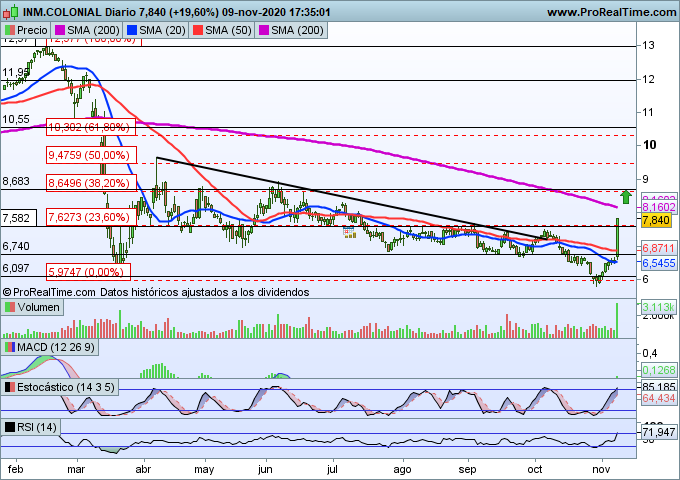 El doble suelo de mercado a corto y medio plazo es más que evidente, y todo indica que en próximas sesiones, si el Ibex es capaz de cerrar por encima de los 7.450 puntos, iremos a buscar alguno de los niveles de corrección proporcional Fibonacci a la última y gran caída, por lo que estimamos que el actual rebote debería llevar a Colonial a alcanzar los 7,62 euros en primera instancia, que es el 23,60% del Fibo previo, por tanto, y si tenemos en cuenta esta retrocesión, todavía quedaría un buen tramo al alza que cumplir en este valor duramente castigado y donde los inversores parece que quieren aumentar el optimismo con el cambio de presidente en los EEUU.