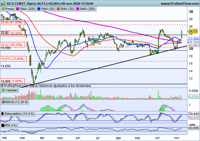 Importantes subidas hoy para la constructora ACS, y ya no por eso, puesto que hay más valores que hay alcanzado mejores revalorizaciones, sino por la zona de resistencia que ha perforado al alza. Así pues, los 23,35 euros que conformaban el 50% de retrocesión proporcional Fibonacci al último tramo bajista, ha sido superado y el valor debería encarrilar hacia su siguiente resistencia cortoplacista situada en los 26,50 euros la acción.
