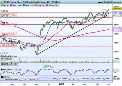 El único y gran problema es que los demás homólogos, dígase índices norteamericanos y europeos ya están cerca de resistencias importantes. Nuestro mercado ha quedado atrás ya que mientras éstos estaban acometiendo importantes alzas nosotros titubeábamos en una zona lateral que se había formado y que continuó a lo largo de las últimas semanas. Con la ruptura que hemos visto estos dias, se abre un nuevo tramo alcista que debería continuar, como mínimo, hasta 9.100 donde encontramos una nueva resistencia intermedia antes de afrontar un nuevo e importante tramo hasta los 10.100, pero este último avance se daría cuando los índices norteamericanos pudieran romper con fuerza sus respectivas resistencias, con volumen, y al unísono. Demasiadas exigencias que podrían no ser cumplidas del todo, bloqueando a nuestro índice pero solamente para el segundo tramo, al menos esos 9.100 pensamos que podrían quedar garantizados.
