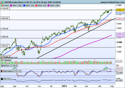 Ponemos hoy nuestra atención en el indice S&P500, puesto que es importante lo que ha ocurrido en las últimas sesiones, y es que hemos visto una superación de la cota de los 4.200 puntos en un escape en "falso", al menos por el momento y mientras estamos elaborando estas líneas. Hay cierto peligro que el mercado americano no rompa definitivamente al alza y se produzcan caídas importantes, donde en el caso del S&P y mientras no perdiera los 4.000 cualquier corrección encajaría dentro de la normalidad, así que no deberemos asustarnos ante un eventual retroceso.