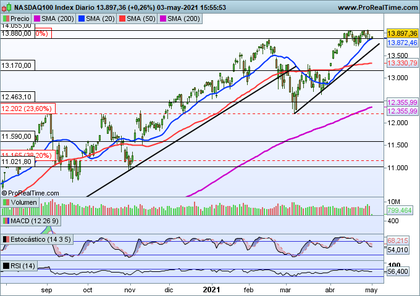 Teniendo en cuenta el análisis anterior, observamos también el comportamiento del Nasdaq-100, principal índice de la tecnología, que también ha frenado su avance en la zona de los 14.000 puntos donde ya ha chocado en varias ocasiones durante las dos últimas semanas. El hecho que no pueda con esta resistencia tan importante y que además funciona como nivel psicológico hace pensar que en próximas jornadas podríamos contar con cierta indefinición.
