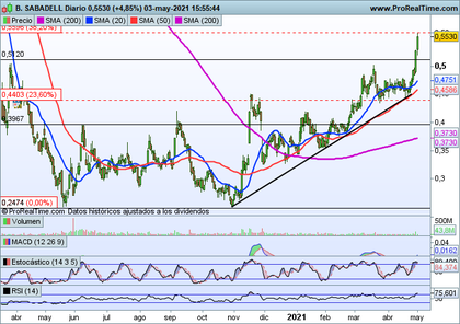 Destacamos el comportamiento de los títulos de Banco de Sabadell, que están protagonizando alzas interesantes desde el punto de vista técnico, y es que el sectorial bancario europeo ya ha superado una zona de resistencia muy fuerte que se encontraba en los 91 puntos, dando paso al despegue de los diferentes activos bancarios. En este sentido, Banco de Sabadell ha arrancado desde la zona próxima a los 0,45 euros por acción, y en el momento de confección de estas líneas acumula un 5,5% de rendimiento diario.