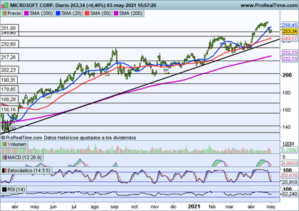 La tecnológica Microsoft es uno de los valores que más nos gustan dentro del mercado americano. Su aspecto técnico es netamente alcista a pesar de los recortes que ha experimentado en las últimas sesiones donde, después de haber ido a buscar niveles de 262 dólares por acción y asistir a una fase de reacción que ha llevado a sus títulos hacia los 250, trata de reaccionar al alza, aunque su principal índice director no supere su respectiva zona de resistencia horizontal.
