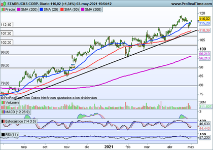 La mayor fabricante y distribuidora de cafés del mundo, Starbucks, es uno de los valores que venimos comentando tienen un gráfico súmamente interesantes y con perspectivas, puesto que está desarrollando una sucesión de mínimos y máximos relativos crecientes en gráficos prácticamente de todas las temporalidades, y ya se sitúa por encima de su última resistencia horizontal situada en los 112 dólares, y objetivos en 120.