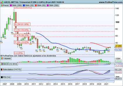 Nueva jornada de altas para la acerera en un nuevo intento de romper al alza la zona de resistencia horizontal y máximos de los dos últimos meses por encima de los 28 euros la acción. Su superación en precios de cierres, daría nuevas alas al valor que no tiene ningún otro objetivo que no sea la zona de los 37,80 euros, donde alcanzaría tan sólo el 23,60% de Fibonacci a lo que fue la última y grandísima caída desde los 140 euros que llego a marcar en el año 2008 hasta mínimos de enero de 2016 en los 6. Segundo objetivo en los 57,50 euros.