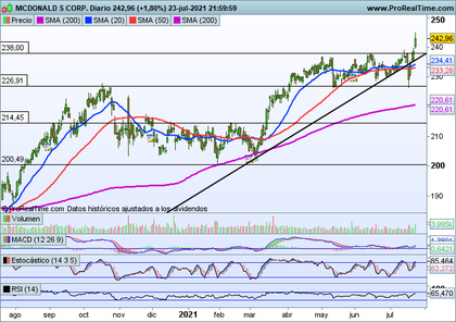 La cadena de comida rápida presenta un aspecto técnico súmamente interesante tanto para el corto como para el medio plazo, y es que el pasado viernes fue capaz de romper al alza la zona de los 238 dólares por acción entrando en subida libre técnica y absoluta con objetivos en los entornos de los 250 $ la acción que es su siguiente nivel a tener en cuenta y zona clave para sus títulos.