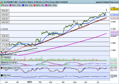 Una vez que el principal índice tecnológico norteamericano Nasdaq-100 ha conseguido por fín batir la zona de los 15.000 puntos (faltaría por confirmar el Dow Jones), algunos de sus principales activos han comenzado una recuperación importante y se sitúan por encima de sus resistencias importantes como son los 2.665 dólares en el caso del gigante de internet Alphabet en su clase C, que rompió el viernes al alza y se situó en subida libre técnica y absoluta, un escenario de corto plazo que mejora sensiblemente su aspecto.