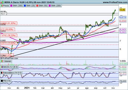 Si hay un valor dentro del selectivo de la bolsa española con un gráfico muy claro, éste es el de Indra, que continúa con una pauta de mínimos y máximos relativos crecientes en gráfico de todas las temporadlidades y que todavía mantiene cierto potencial, al menos a corto plazo. Su aspecto es alcista tanto para el corto como para el medio plazo y todo parece indicar que así va a seguir siendo durante las próximas jornadas.
