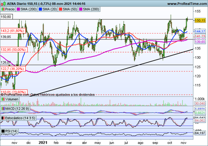 En el caso de Aena, observamos un valor alcista con formación de mínimos crecientes en gráfico de todas las temporalidadesy que ya se sitúa por encima de lo que fue el 61,80% de su retrocesión proporcional Fibonacci al último movimiento bajista previo que comenzó en marzo de 2020 en la zona de los 176,50 euros por acción hasta los mínimos de ese año en los 89. Así pues, ya se sitúa como decimos por encima de los 143 euros y ello conlleva que pueda seguir avanzando a corto plazo.