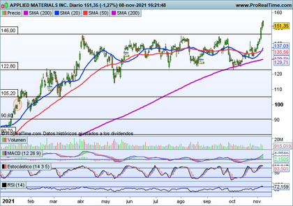 Después de un período más que extenso en el que los títulos de Applied Materials han permanecido en todo momento dentro de un amplio lateral comprendido entre la zona de los 122 y los 145 dólares por acción, finalmente han roto al alza esta última zona de resistencia entrando técnicamente en subida libre absoluta, algo que genera connotaciones mucho más alcistas.