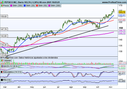 En cuanto al mayor embotellador de bebidas Pepsi-Cola del mundo, su aspecto técnico continúa siendo alcista para todos los plazos. Una secuencia de mínimos y máximos relativos crecientes que ha terminado por romper su resistencia más inmediata y máximos de todos los tiempos en los 158 dólares por acción, que ha dado paso a mayores subidas, si cabe.
