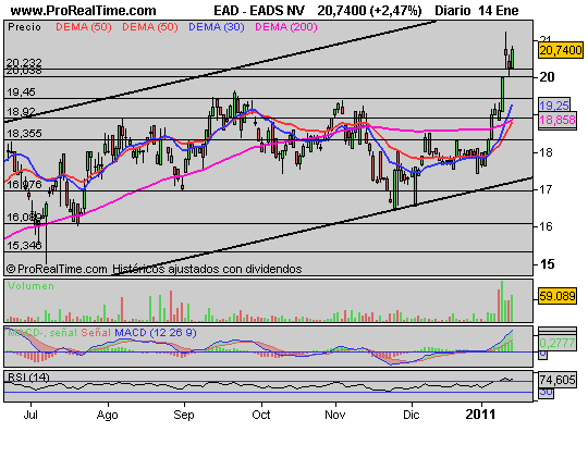 EADS: Cotiza muy barata, un buen ratio rentabilidad-riesgo, cotiza con un fuerte descuento y parece que está empezando a despertar, firmando nuevos contratos y puede irse a la zona de 24 euros en el corto plazo.