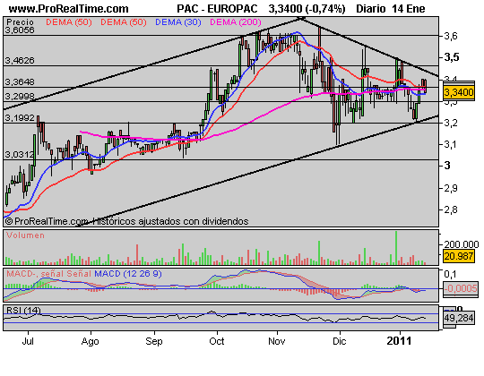 EUROPAC: Valor alcista , inmerso dentro de la tendencia de medio plazo con un soporte en los 3.30 para el ultra corto plazo. La pérdida de la línea de tendencia sería el hipotético soporte que colocaríamos y la usperación d elos 3.45, un posible nivel de entrada con objetivo en 3.60 donde podría empezar a salir algo de papel.