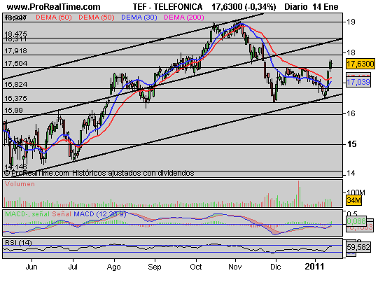 TELEFÓNICA: De lo mejor que está en el sector. Estamos pensando seriamente, en una compra para la cartera de Mercatrading. El stop queda cerca, y esperemos no abra mañana con un fuerte gap al alza, si no lo hace, la incorporaremos a la cartera. Os enviaré SMS cuando se vea el momento óptimo para realizar la entrada.