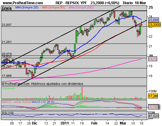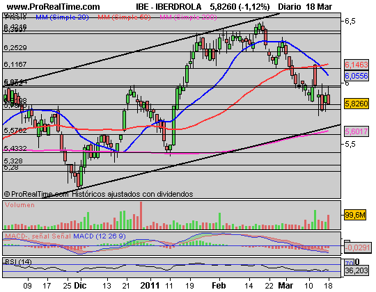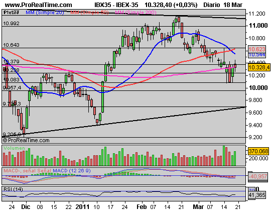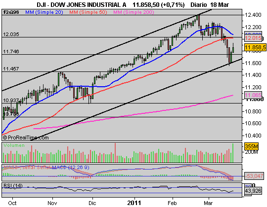 DOW JONES: El gráfico es claro: Fuerte retroceso hacia la base del canal entorno a los 11.600 puntos y respetada perfectamente al cierre de la sesión del miércoles y jueves. Hemos iniciado un rebote desde estos niveles que podría llevarnos, si no aparece un nuevo drama, sea Libia, sea centrales nucleares, etc. a los 12.000 puntos esta misma semana de forma inmediata.