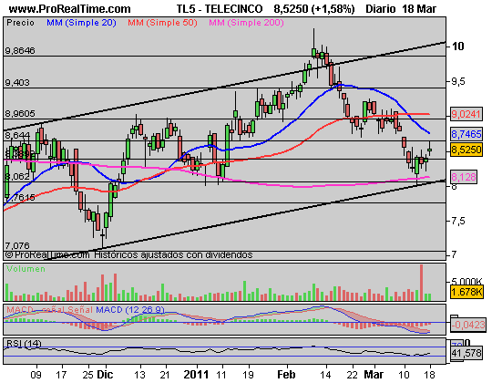 TELECINCO: Rebote desde la base del canal con un Macd marcando sobreventa y un rsi en la parte baja. Solamente faltaría un poco más de volumen para dar fiabilidad a la subida. Puede ser , también un valor a medio plazo para quien tenga liquidez suficiente para incorporarla a su cartera.