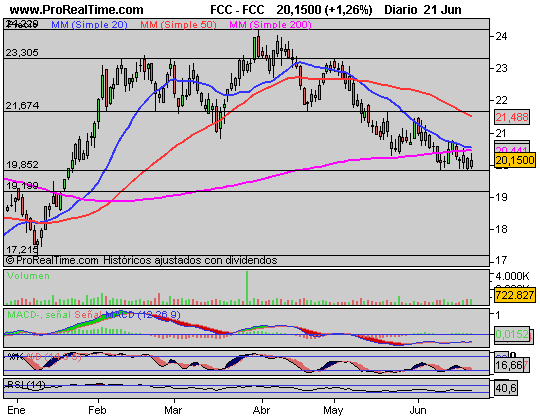 FCC: Apoyo en la zona de soporte, con cierre ligeramente por encima de ésta. Comportamiento mejor que el mercado, y esperamos pueda hacer suelo por esta zona , no nos salte el stop en precios de cierres, en los 19.70 euros, y consiga rebotar desde aquí.