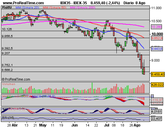Ante todas estas advertencias, os paso el gráfico de nuestro ÍBEX-35, que lleva la friolera de 11 sesiones casi consecutivas de caídas. Rotura de mínimos anuales y de 2 años. Mañana debería recuperar nieles de 8.500 en apertura o hacerlo pronto, de lo contrario, podríamos estar ante un mercado sumamente inseguro y con rotura de niveles importantes a la baja.